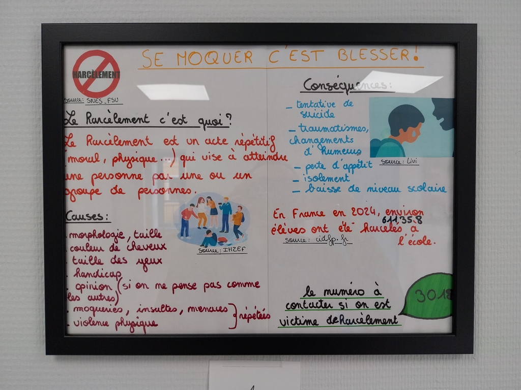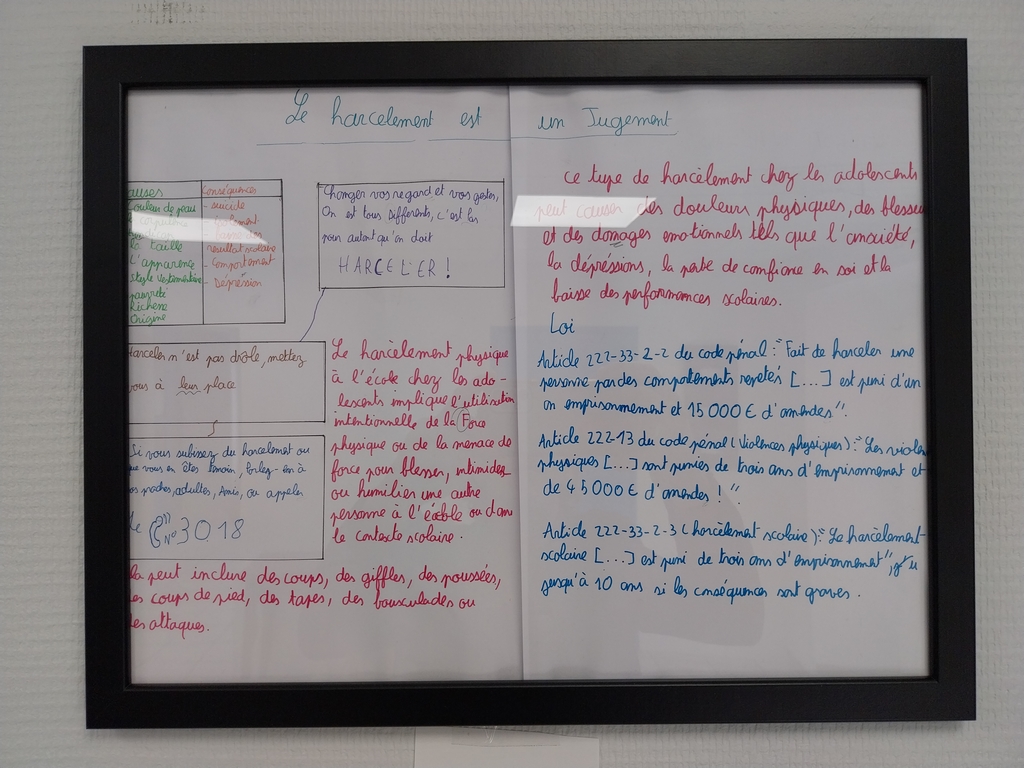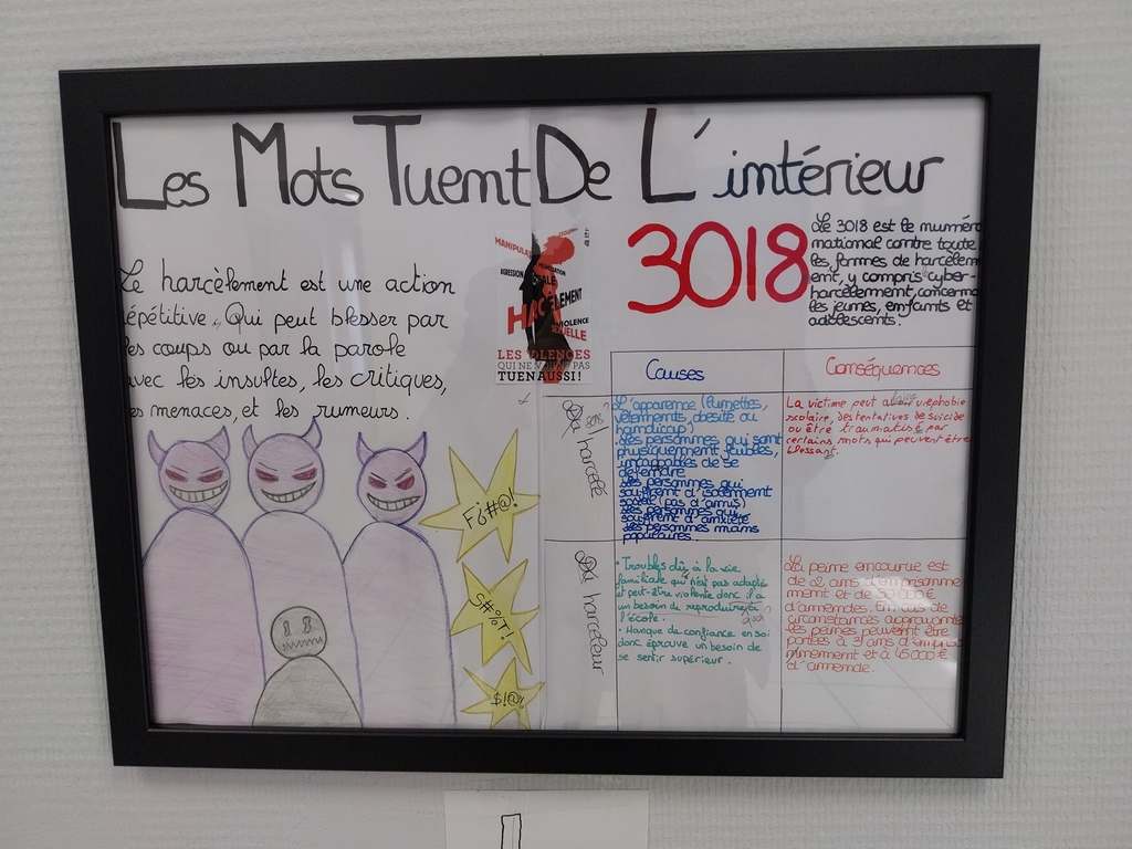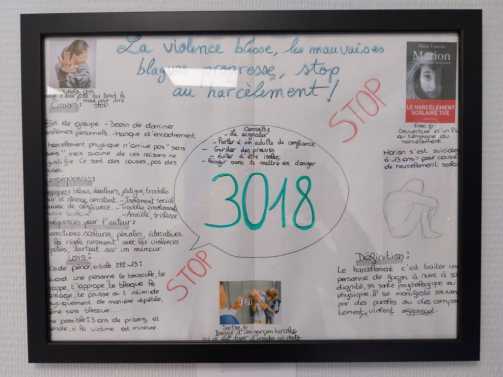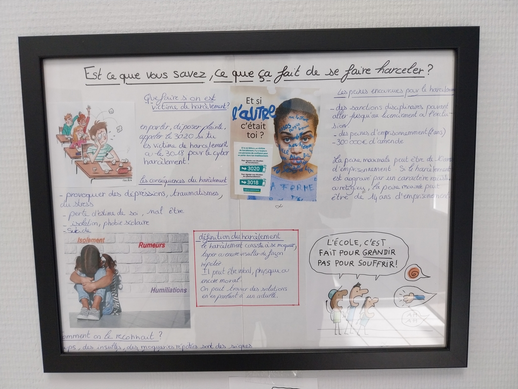 Après avoir lu un livre sur le harcèlement, les élèves de 3° ont réalisé des affiches expliquant les causes et les conséquences de cette forme de persécution, à la fois pour le harceleur et le harcelé.