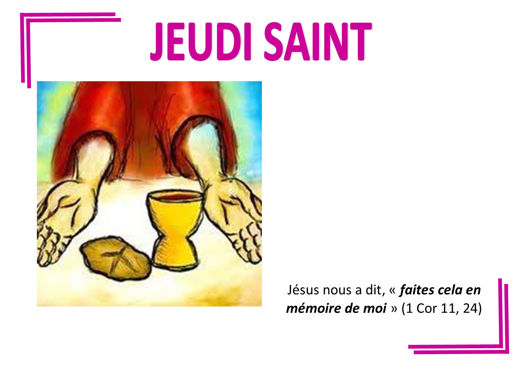 Le Jeudi saint est le jeudi précédant Pâques. Il commémore pour les chrétiens l’institution de l’eucharistie par Jésus-Christ lors de la Cène, dernier repas pris par Jésus avec ses disciples.
