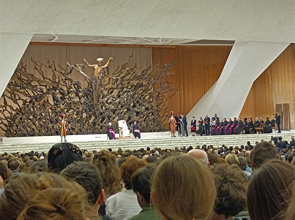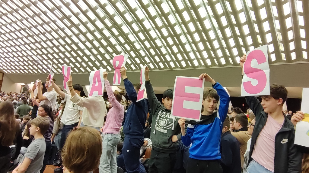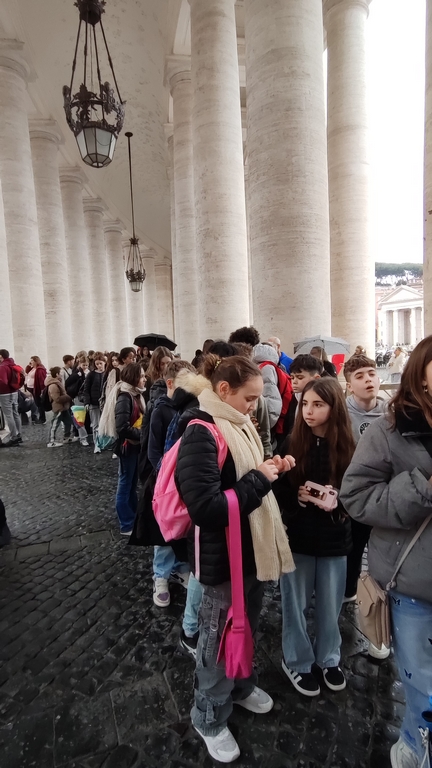 Le mercredi restera sans doute l’un des moments les plus marquants du séjour. Les élèves ont eu la chance d’assister à l’audience générale du mercredi matin au Vatican. Dans l’immense et impressionnante Salle Paul VI, près de 6000 fidèles attendaient avec recueillement l’arrivée du Pape Léon XIV. Face à l’imposante sculpture représentant la Résurrection, l’atmosphère était chargée d’émotion. Les lettres formant le nom « St Charles », soigneusement préparées, ont pu être agitées à plusieurs reprises lorsque le groupe a été cité. L’instant où le Saint-Père a adressé un salut au collège restera gravé dans les mémoires.